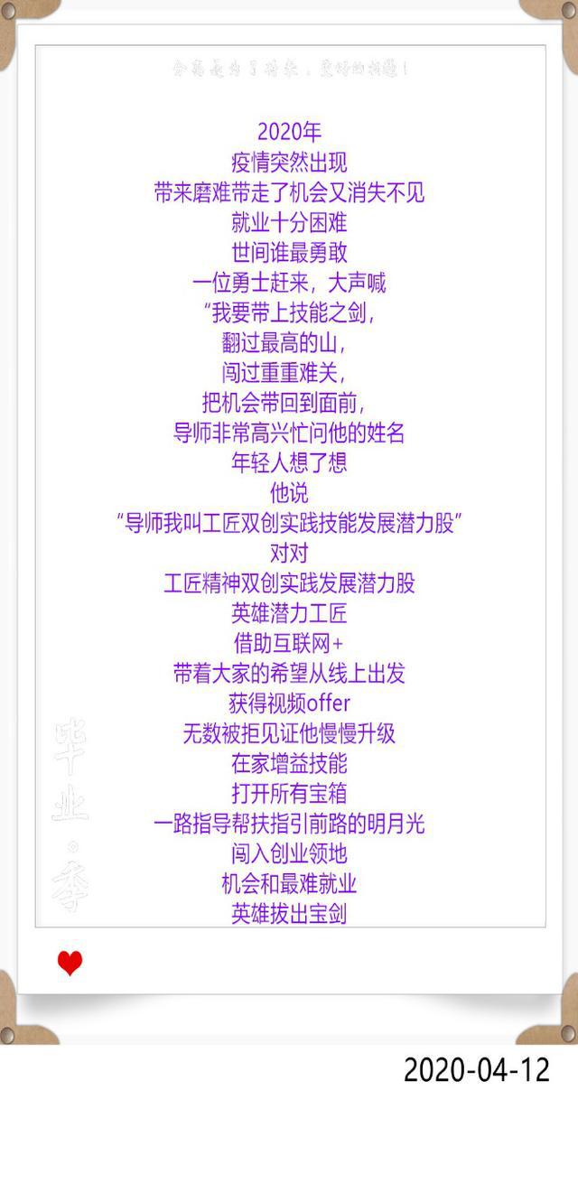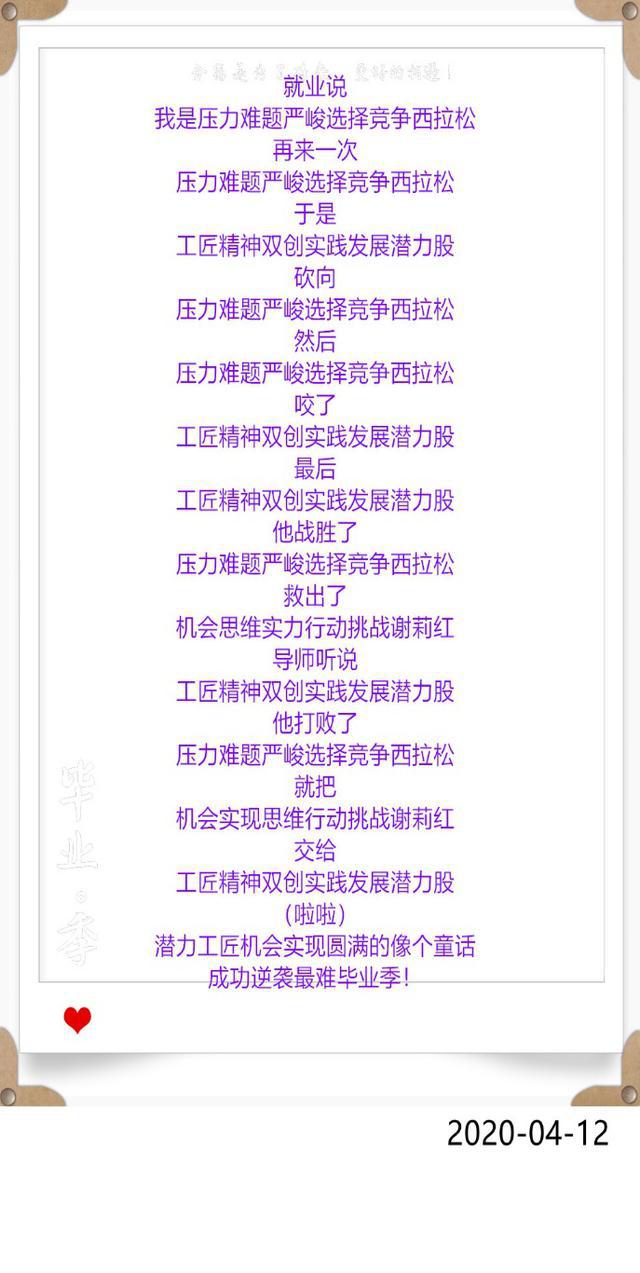 最难毕业季,“难”中有“机”。2020届毕业生的你们,应用辩证思维看待疫情之下的就业问题,看到危中有机,转危为机。要看到当前形势下,党中央、国务院高度重视高校毕业生的就业工作,及时作出一系列重要决策部署;要看到从中央到地方政策倾斜力度、就业增加力度、就业升学渠道拓展力度;要看到疫情之后一大批战略性新兴行业、产业的崛起,这些都为大学生毕业带来了难得的机遇期。这场疫情大考,各行各业中的青年用他们的实际行动向社会展示他们的青春力量,你们要从榜样中汲取力量,积极转变就业观念,到祖国最需要的地方去,到一线基层就业、到部队参军入伍,到国家重大领域、重大项目中就业,将个人价值的实现与国家命运、社会发展紧密联系起来,与时代同步伐,与人民共命运!让青春在奋斗中发光!