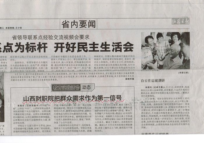 学院位于太原与晋中交界处,2010年因修建中银卫铁路,封堵了原有桥洞,新建桥洞坡陡弯急且未硬化,雨天积水严重,车辆无法通行。唯一的一条公交线路也被封堵,师生出行只能乘坐私人运营的小巴车。教育实践活动伊始,道路出行困难成为师生反映最强烈的问题。经院长李晋平多方奔走,最终促成相关部门负责人到桥洞现场办公,修复了桥洞,恢复了公交车运营。
