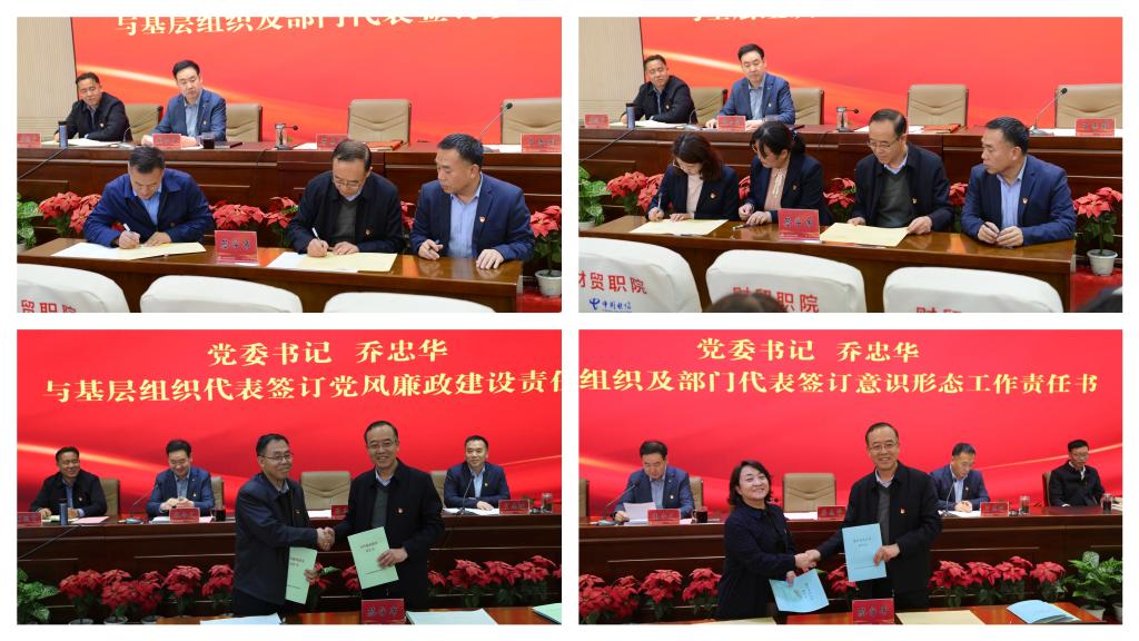 会上,学院党委书记乔忠华与班子成员、基层组织代表分别签订2024年党风廉政建设责任书、意识形态工作责任书和安全稳定工作责任书。