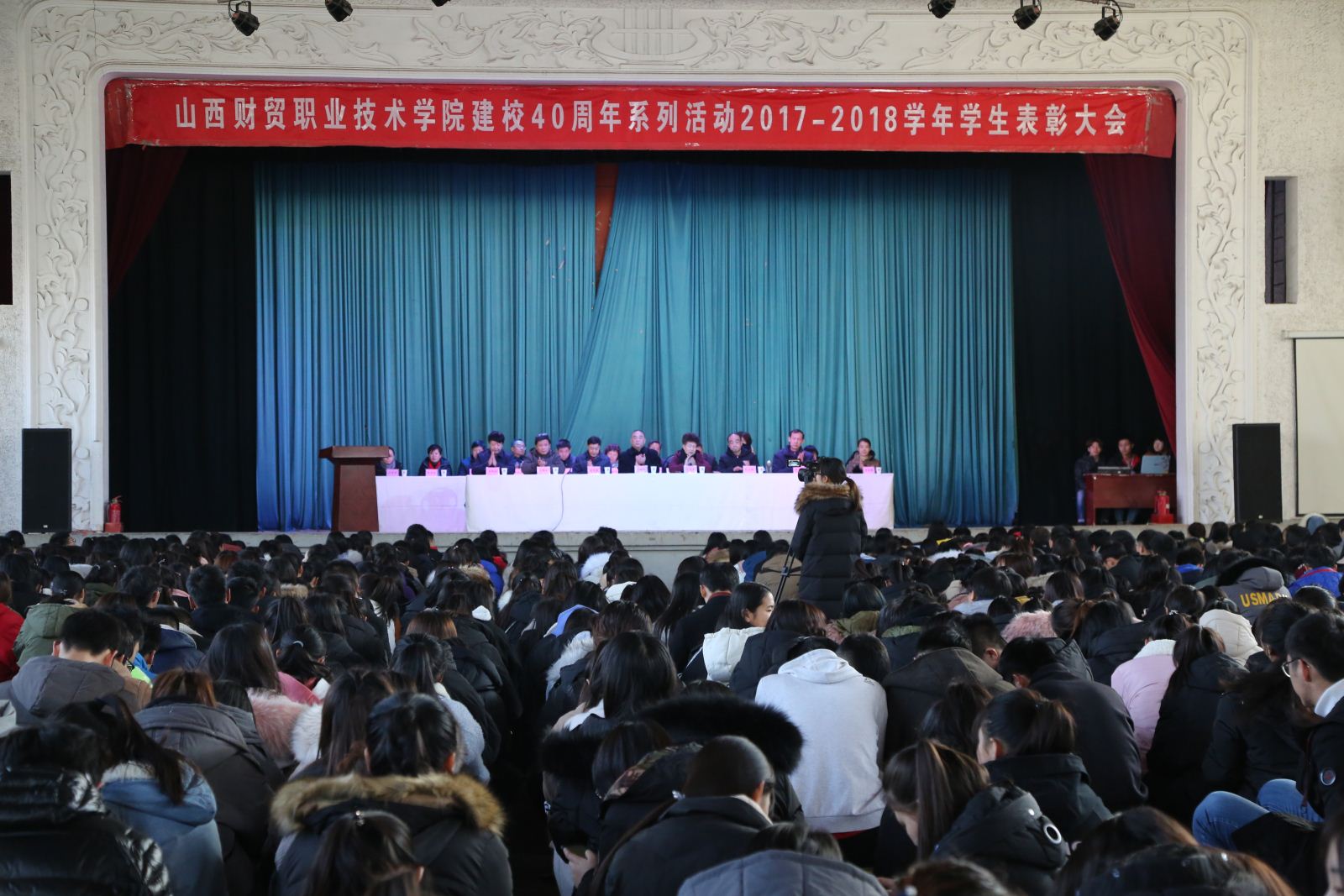 2018年12月17日下午2:30,山西财贸职业技术学院建校四十周年系列活动2017—2018学年学生表彰大会在学院大礼堂隆重召开。学院领导,各系相关处室负责人出席大会,各系团委负责人、新生班主任、获奖学生代表以及2018级学生参加了表彰大会。