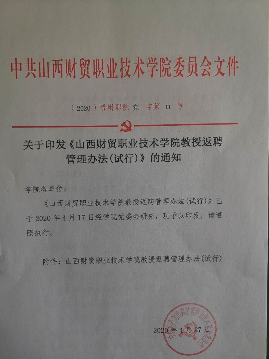 (一)学院与返聘教授就返聘期间工作任务、要求签订《山西财贸职业技术学院教授返聘协议书》,返聘教授须按照返聘岗位要求履行岗位职责并接受学院聘期考核,包括:基层组织负责政治考核和人事处的业务考核。考核结果人事处备案。
