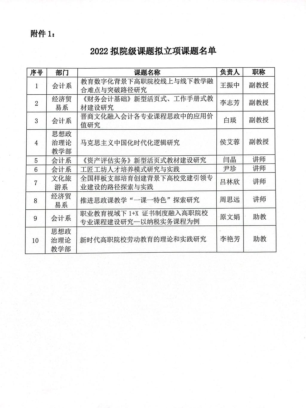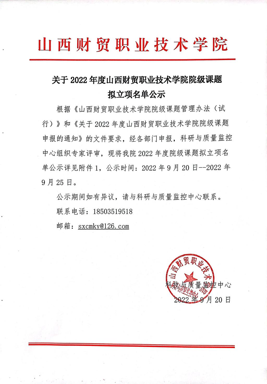 关于2022年度山西财贸职业技术学院院级课题拟立项名单的公示