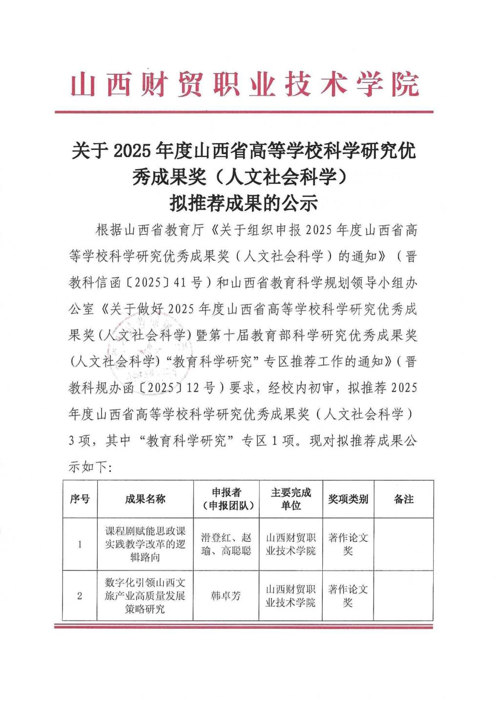 关于2025年度山西省高等学校科学研究优秀成果奖(人文社会科学)拟推荐成果的公示