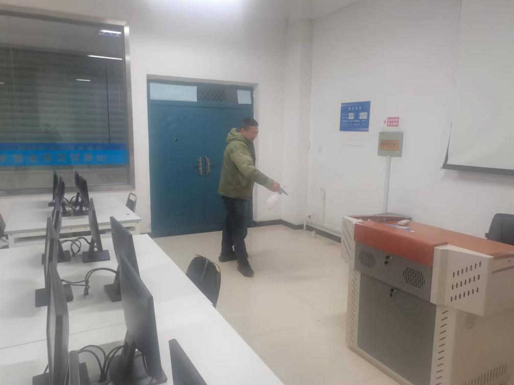 为营造了卫生安全的教学环境,赵喜峰老师和郭俊宝老师每天对学生上课机房进行彻底的消毒消杀,开窗、开门、通风换气,用消毒用品擦拭桌面、门把手及用消毒液喷洒地面,充分发扬不怕苦的精神,干劲十足,不放过任何一个位置。