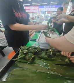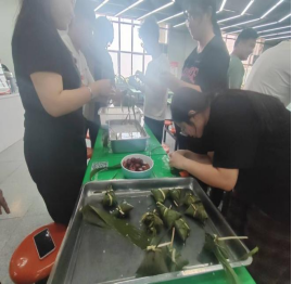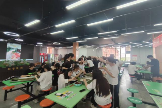 5月29日下午14:00,学生餐厅二层特别设置了“包粽子体验区”,邀请专业厨师现场示范教学。在员工师傅的耐心指导下,师生们学习折粽叶、填糯米、裹馅料、捆棉线等步骤,尽管手法生疏,但大家热情高涨,现场欢声笑语不断。同学们在实践中体会到了包粽子的乐趣,也感受到了传统文化的魅力。一位参与体验的同学分享道:“第一次亲手包粽子,虽然形状不太好看,但过程特别有趣,也让我更理解了传统文化的意义。”