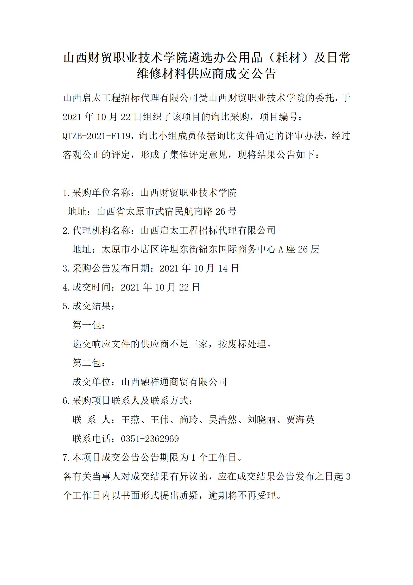 山西财贸职业技术学院遴选办公用品(耗材)及日常维修材料供应商成交公告