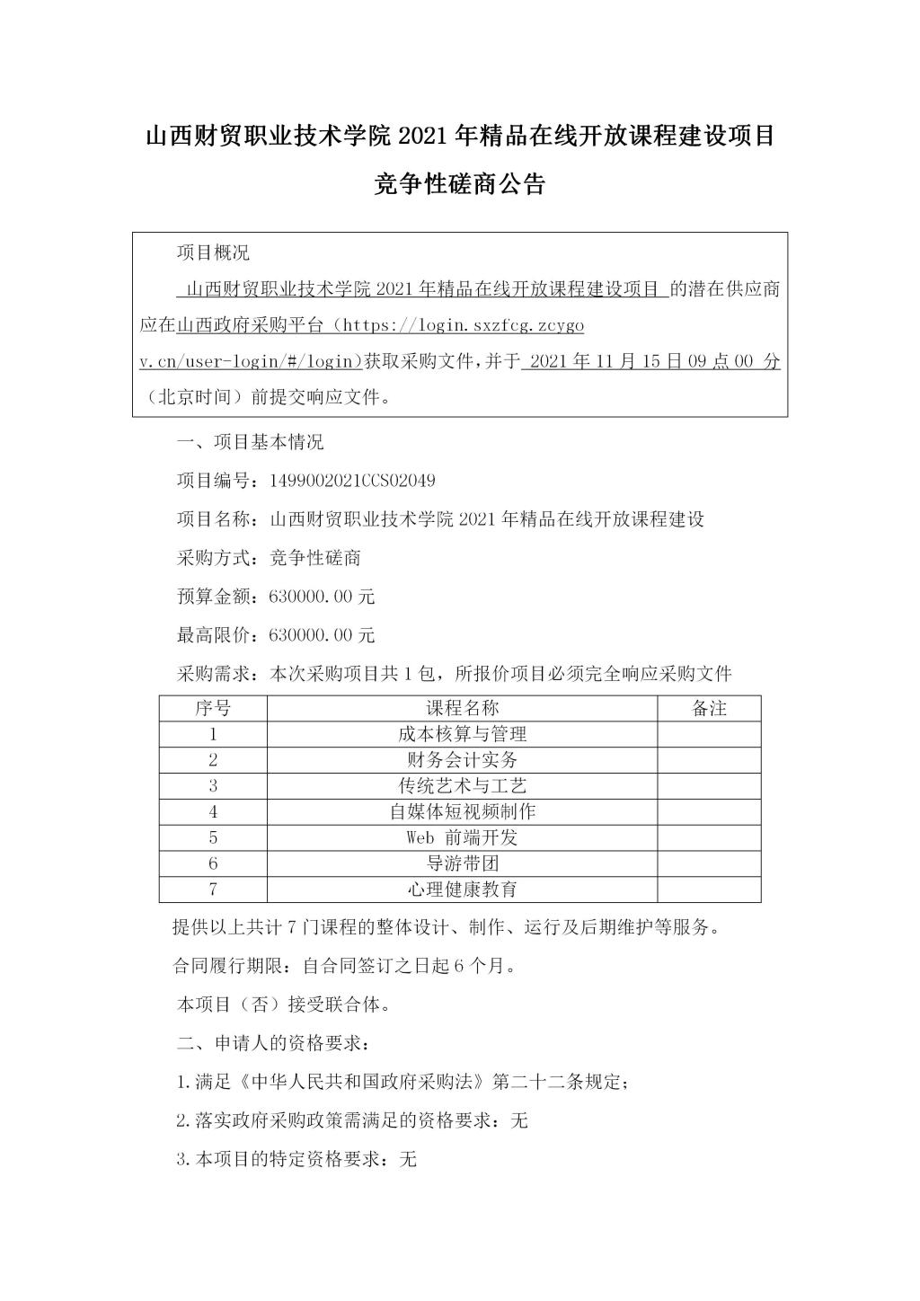 山西财贸职业技术学院2021年精品在线开放课程建设项目竞争性磋商公告