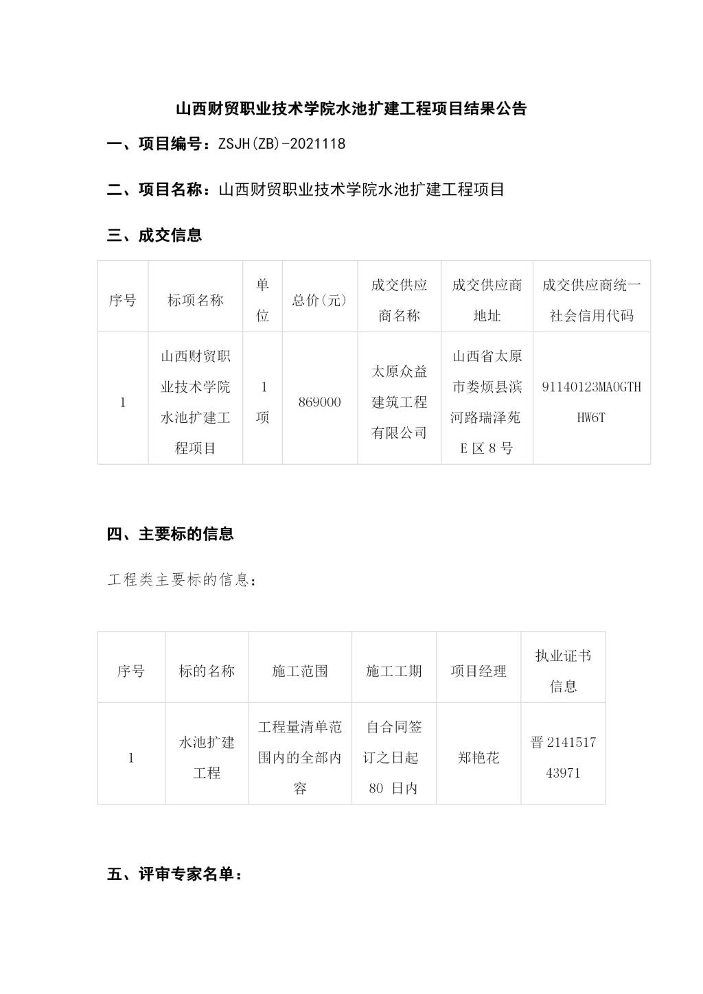 山西财贸职业技术学院水池扩建工程项目结果公告