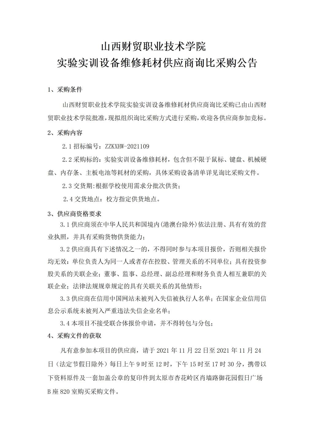 山西财贸职业技术学院实验实训设备维修耗材供应商询比采购公告