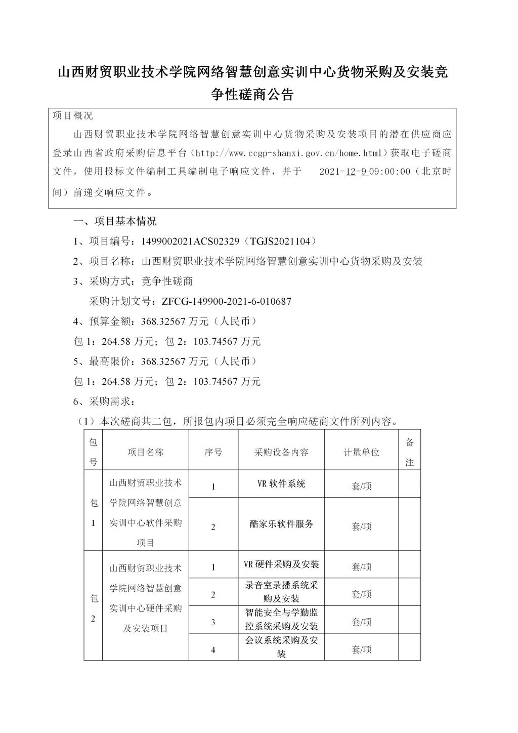 山西财贸职业技术学院网络智慧创意实训中心货物采购及安装竞争性磋商公告