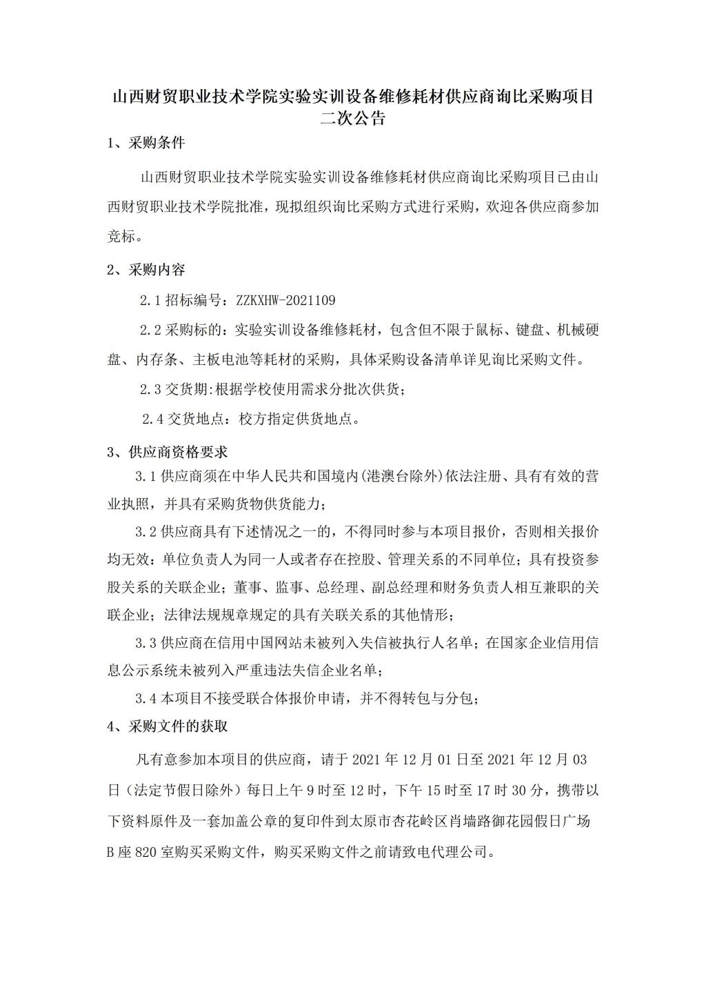 山西财贸职业技术学院实验实训设备维修耗材供应商询比采购项目二次公告