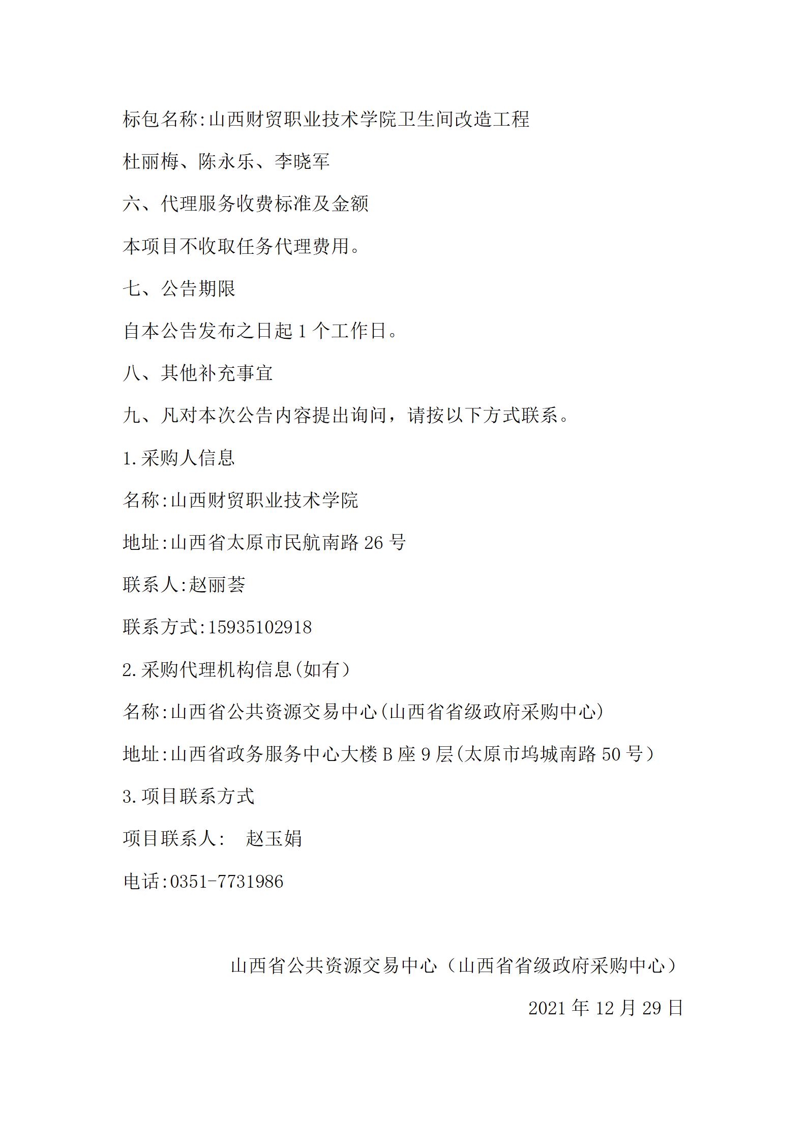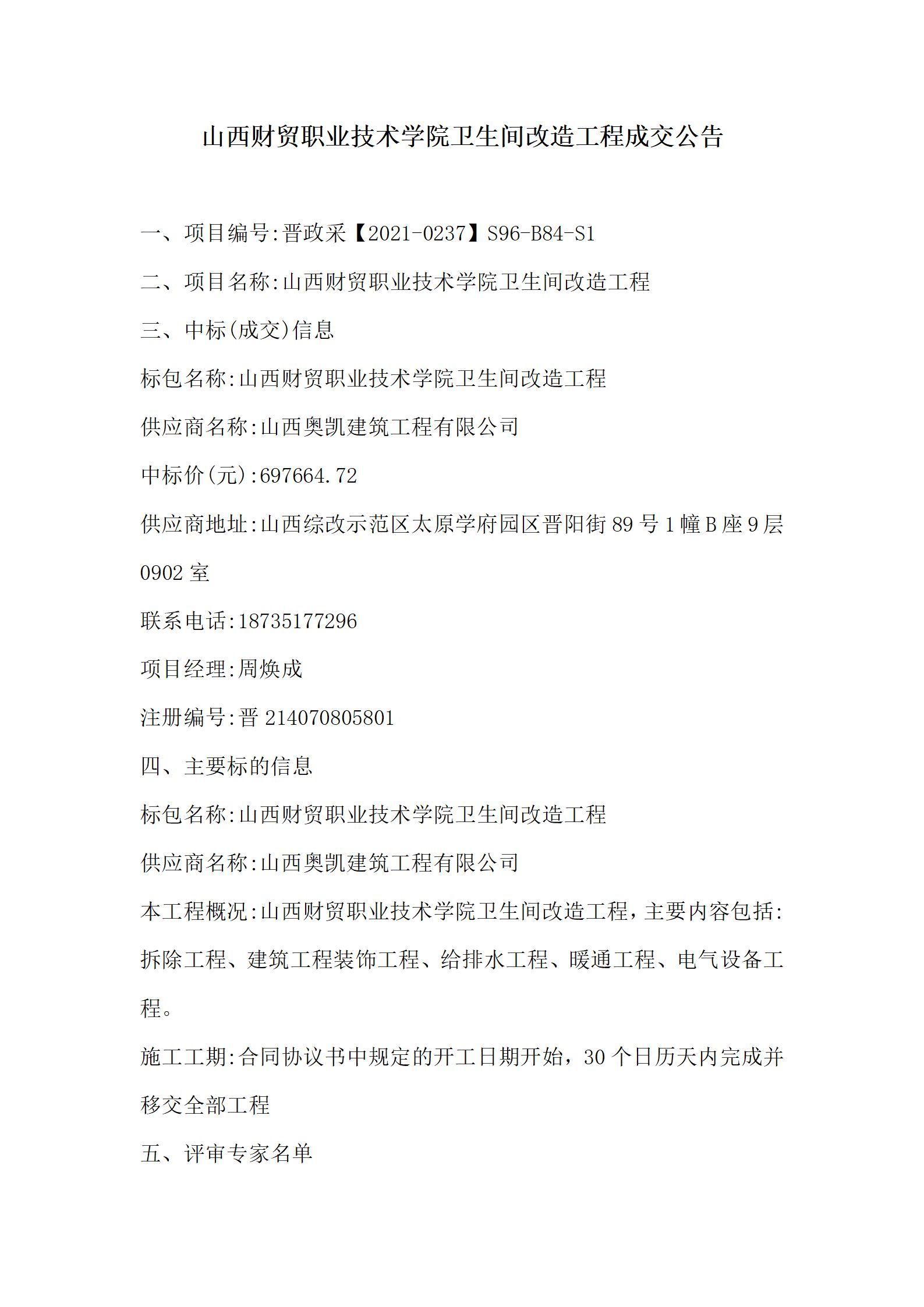 山西财贸职业技术学院卫生间改造工程成交公告