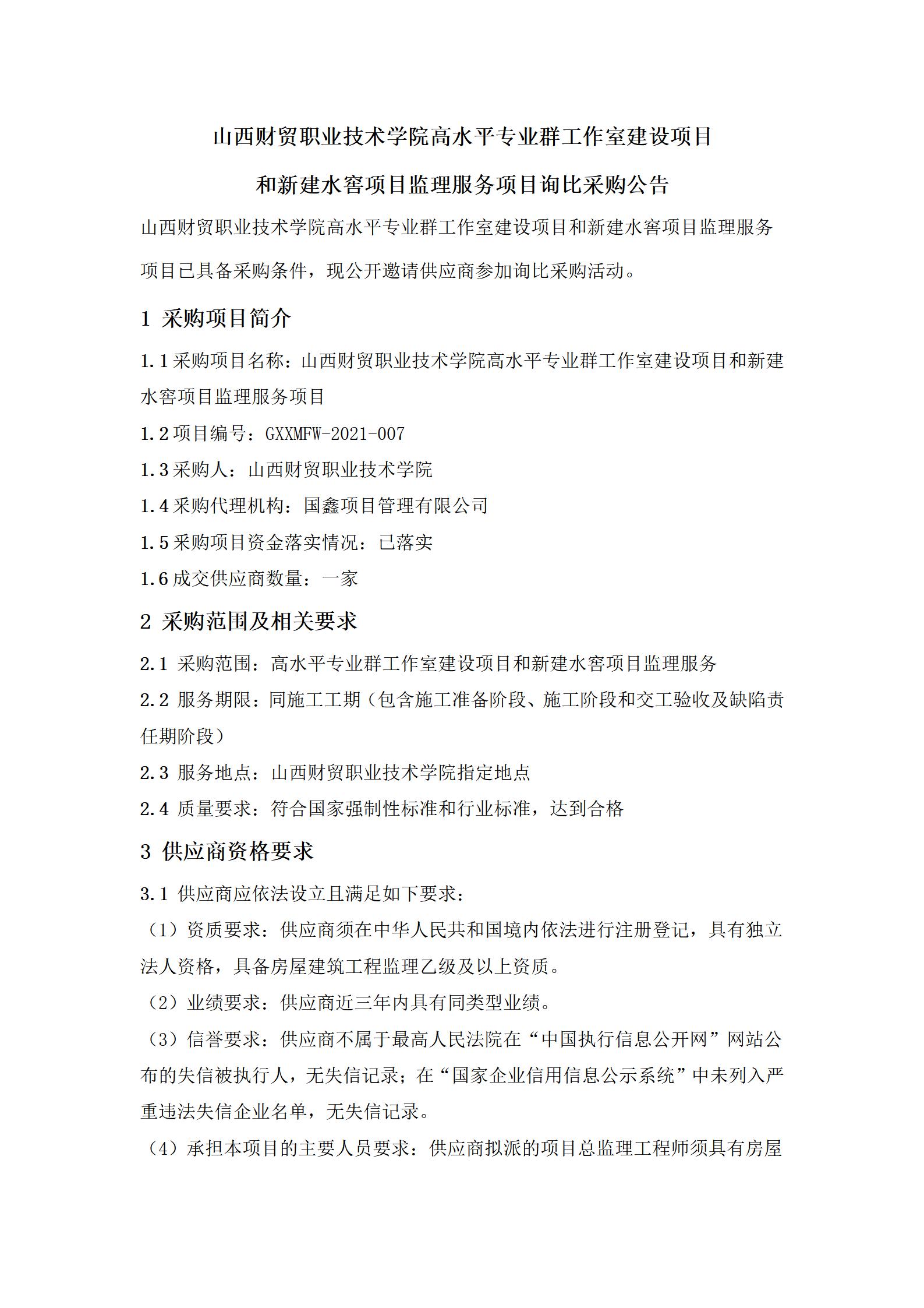 山西财贸职业技术学院高水平专业群工作室建设项目和新建水窖项目监理服务项目询比采购公告