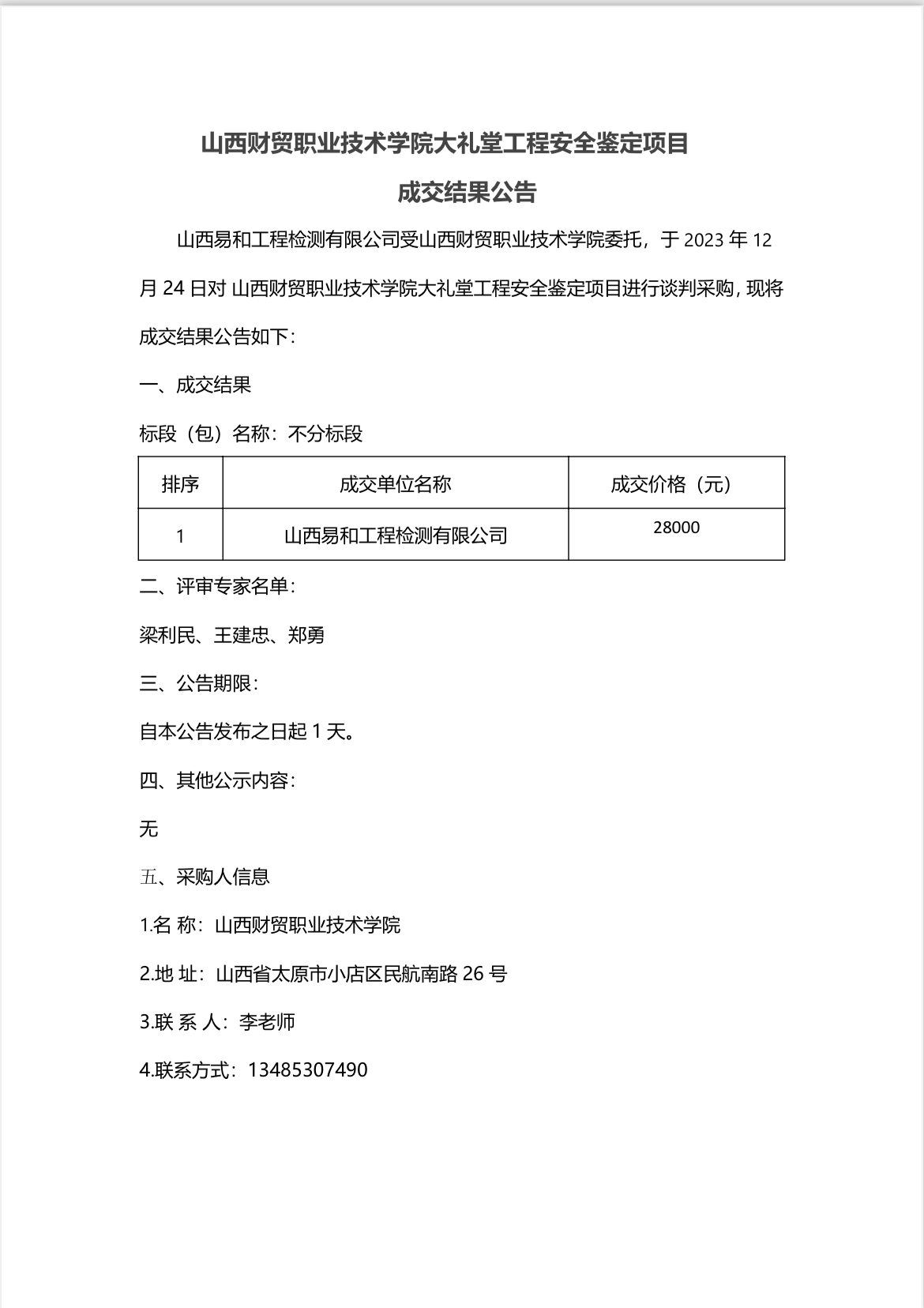 山西财贸职业技术学院大礼堂工程安全鉴定项目成交结果公告