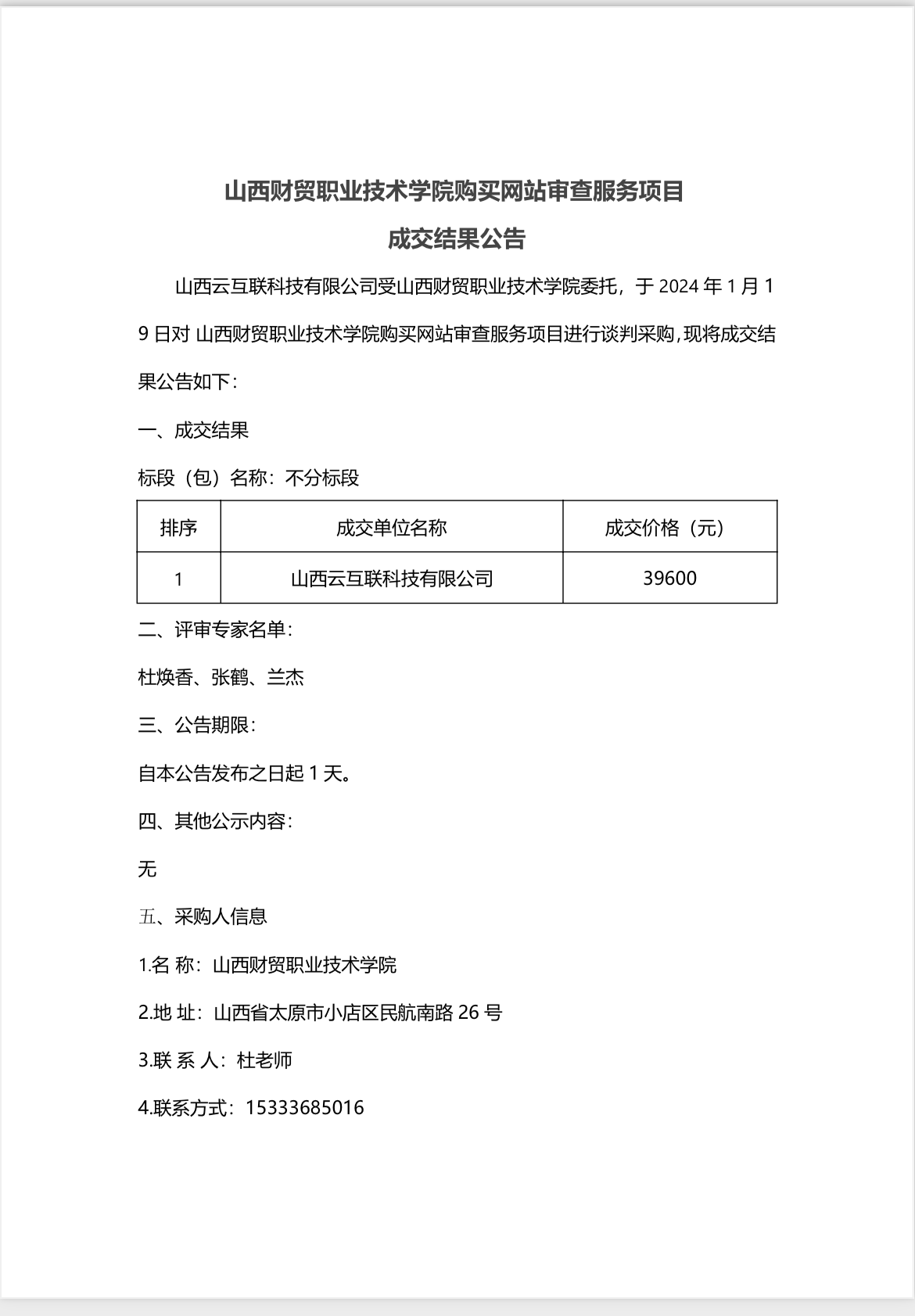 山西财贸职业技术学院购买网站审查服务项目成交结果公告