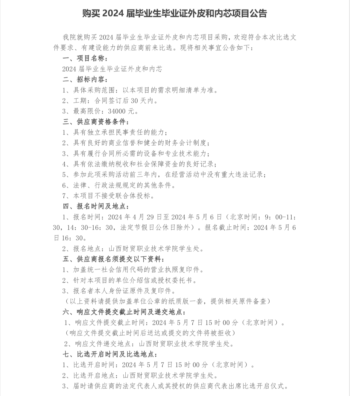 购买2024届毕业生毕业证外皮和内芯项目公告