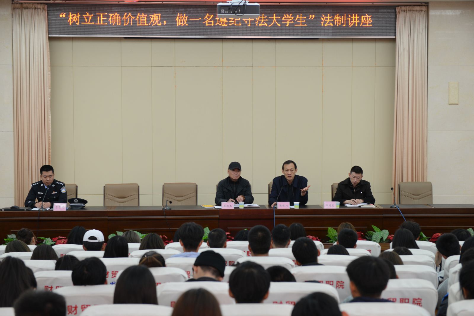 11月4日下午,我院邀请黄陵派出所巡逻中队副队长于贵虎同志在励志楼大报告厅为我院师生开展了以“树立正确价值观,做一名遵纪守法大学生”为题的法制讲座。学院副院长张耀川、保卫处全体人员及各新生班代表参加了本次讲座,讲座由保卫处处长吴艳东主持。