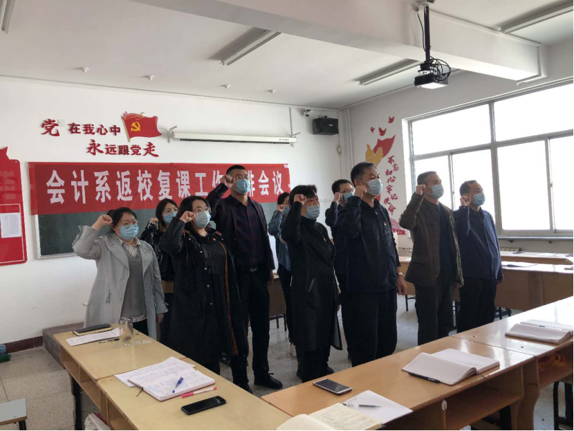 会议首先由邢学军同志作为领誓人带领参会党员面对党旗进行宣誓。随后,程荣同志强调了会计系返校复课工作的方案和纪律要求;李双旺大夫针对防疫医务知识、测温仪操作方法及注意事项等内容进行了培训;邢学军同志表态,会计系有信心、有决心顺利完成本次返校复课工作任务,同时希望参会的毕业班辅导员及任课老师提高政治站位,拥有高度的责任感和使命感,给予同学们关爱和积极引导,不折不扣完成本次复课任务,打赢此次返校复课战役。