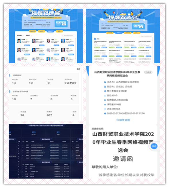 4.探索全新就业模式,确保毕业生足不出户找工作。为进一步做好就业服务,提升我院就业工作质量,分别与云就业、百强就业平台经过多次协商、精心策划,于3月27日召开山西财贸职业技术学院2020届毕业生春季大型线上双选会,并于3月21日-5月15日召开山西财贸职业技术学院2020年网络视频双选会,这次大型的线上双选会所有报名参会的用人单位报均为免费,用人单位依托线上平台发布招聘信息,进行线上简历查询和收取;学生通过平台查看招聘信息和网上简历投递,并可现场通过语音、视频等方式开展面试。目前已有234家用人单位报名参会,191家用人单位通过学院审核,学生投递简历数921次。