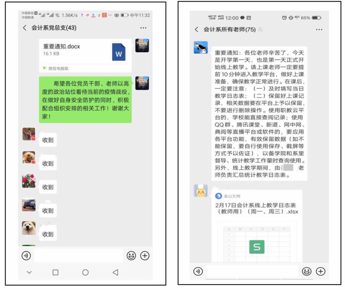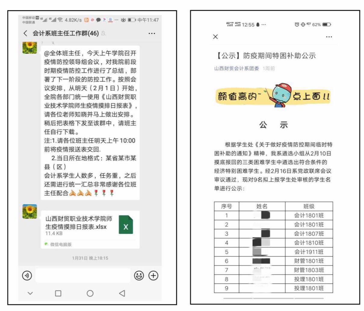 按照院系防疫工作的总体部署,我系认真开展各项疫情防控行动。对全系58名教师、59个班级2886名学生(包括20个班级966名实习生)的体温、当日所在地等信息进行逐日细致统计,对摸底排查到的1名湖北荆州籍学生、44名平遥籍学生的身体状况进行跟踪重点关注;要求会计系所有师生做到居家不外出,在没有得到学院和系里的返校通知前不得返校,在外实习学生没有学校和企业的明确通知一律不能返回实习地点;按照学院《应对疫情开展在线教学的实施方案》,组织我系教师认真参加授课平台使用方法培训,提前做好线上教学模拟演练,动员教师在保证线上专业知识教学的同时,围绕“课程思政”的要求,结合当下抗击疫情过程中涌现的先进人物和感人事迹,加强德育渗透,对学生进行爱国主义教育、社会责任感教育、自律教育、感恩教育,激发学生的爱国情、报国志,增强他们抗击疫情的信心、决心和意志;对我系因疫情造成困难的学生进行摸排,按照学生处《关于做好疫情防控期间临时特困补助的通知》,通过线上党政联席视频会议研究决定对黄天赐等9名同学报送学生处予以补助,表达了学院、系里对困难学生的关怀和帮助;在公布省教育厅和学院开设的心理健康公众号、热线的基础上,安排我系国家二级心理咨询师秦晓斐老师及时了解师生的心理咨询需求,做到及时疏导,避免因疫情可能产生的心理问题对师生的伤害。一系列措施的落小、落细、落实保证了疫情防控不留死角,构筑了我系疫情防控的钢铁长城。