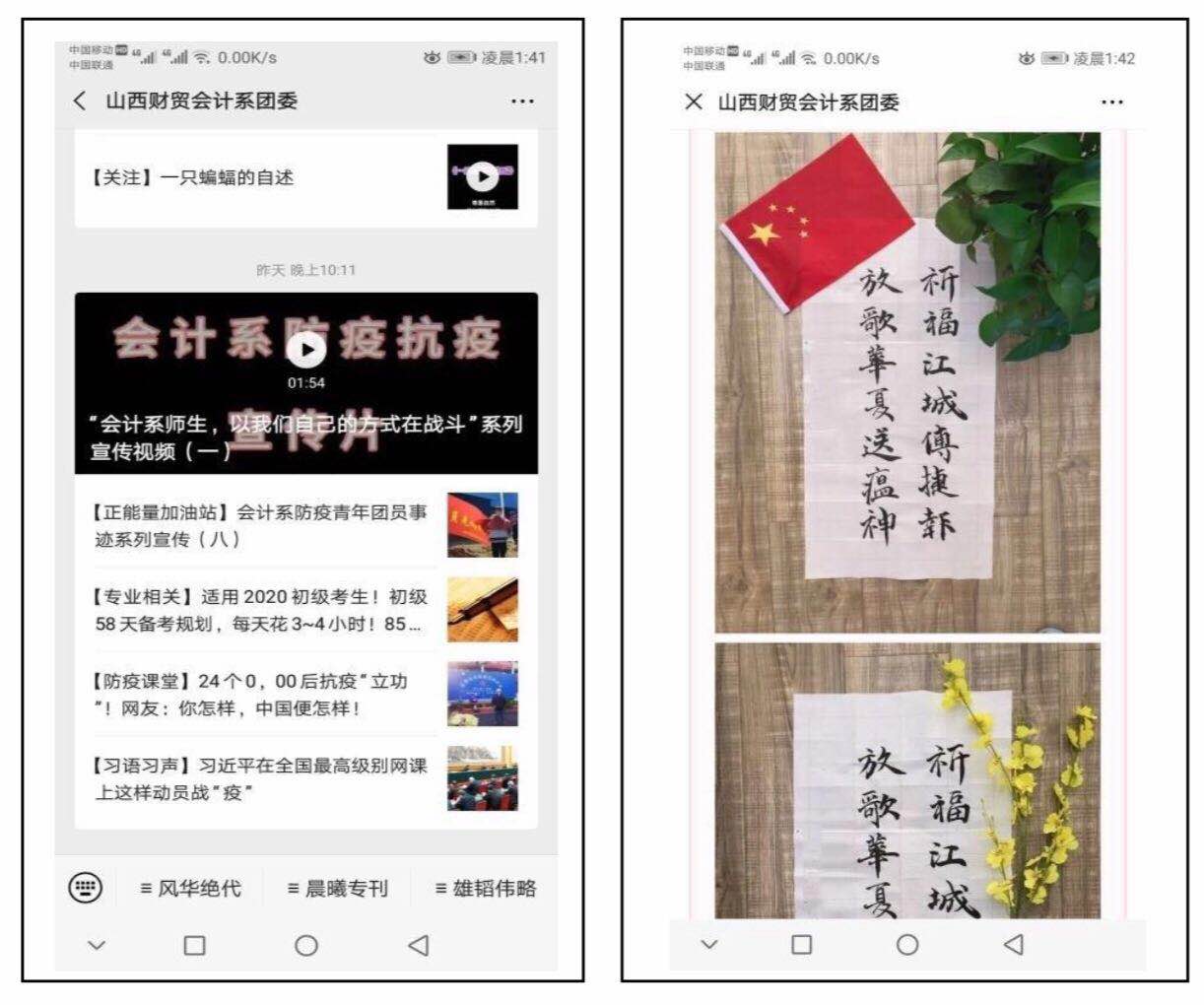 针对严峻的疫情形势,会计系通过微信群、公众号、QQ群、视频会议、线上班会、课程思政、防疫活动等多种有效途径和方式,引导我系广大师生理性看待疫情,提升爱国、爱党意识,积极参与防控疫情,增强战胜疫情的信心。自疫情发生以来,我系通过公众号累计推送防疫抗疫信息近50条,开辟【防疫课堂】栏目对疫情防控知识进行了广泛宣传,增强了师生自我防范意识和防护能力;开辟【正能量加油站】对我系在基层社区(村)进行疫情联防联控的预备党员、入党积极分子和优秀团员的事迹进行系列宣传报道,通过树立典型号召更多青年学生、团员参与进来,展现他们作为新时代青年的责任与担当;举办“疫情防控,从我做起”诗歌、对联作品征集活动,活动信息单条点击量达到了近3000人次;筹办“‘艺’起加油 共战疫情”师生书画作品征集活动和防疫法治视频征集活动,鼓励师生发挥艺术特长创作歌颂英雄事迹、宣传防疫知识的文艺作品,用文艺力量支援抗疫工作;集全系师生力量摄制“会计系师生,以我们自己方式在战斗”系列宣传片,弘扬抗击疫情正能量,引导抗疫主旋律,营造出了全系师生参与疫情防控的宏大氛围。