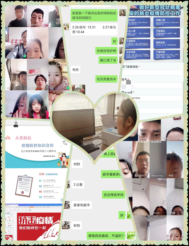 思想引领,尽职尽责。在抗击疫情的关键阶段,会计系专兼职辅导员(班主任)不仅是学生疫情防控战疫的坚强力量,更是一道温暖独特的风景线。他们每日关注疫情变化,转发官方媒体关于新型冠状病毒引发的肺炎疫情的报道,做好党和国家防疫理论政策的宣讲者、传播者。他们通过微信群、QQ群等网络渠道,引导学生客观认识新型冠状病毒,提醒学生务必要摒弃 “哪那么容易被传染”的侥幸思想,潜移默化地对学生进行生命教育、科学教育。他们心系离校在外的实习生,逐一联络实习生,关心实习生的工作,关注实习生的生活,与实习生开视频会议、聊家常,了解在外学生的难处,解决学生的困难,努力当好学生思想、健康和学业的“守护者”。