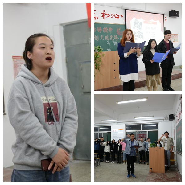 活动一开始,伴随着同学们齐声的倒计时呐喊,本次主题团日活动在全体共唱《共青团团歌》中拉开了序幕。在“辅导员说”环节中,由辅导员史卓然老师深情的为同学们讲述了雷锋生平与雷锋精神的内涵;在情景剧《车站雷锋》环节更是通过同学们的精彩演绎,引发了大家对当代青年传承雷锋精神的思考。此外,通过“身边的雷锋”访谈节目、女声独唱、三人诗朗诵、雷锋知识抢答、重温入团誓词、全体合唱《学习雷锋好榜样》等环节,让同学们真正学习和体会到了雷锋同志那志存高远、胸怀宽广与助人为乐、勇于奉献的精神。活动结尾,辅导员对精心准备和积极参与本次活动的全体同学们表达了衷心感谢。