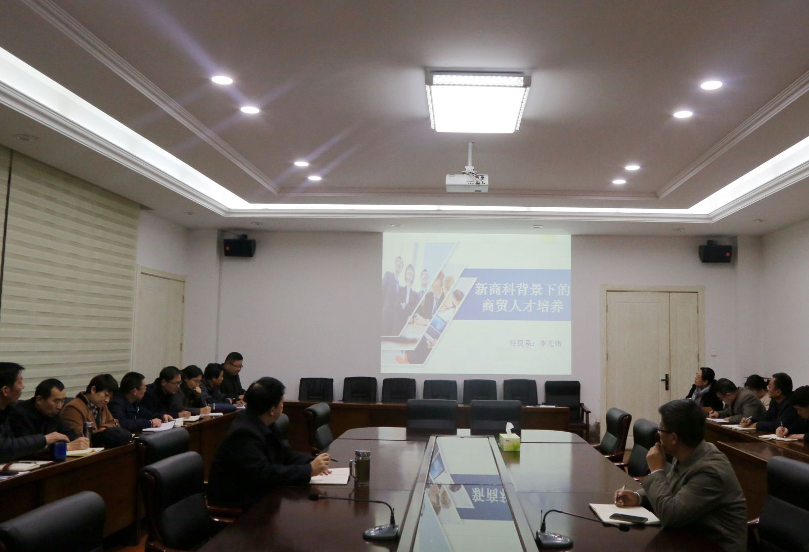 11月20日下午3:00,我院在砺志楼大报告厅组织党委中心组(扩大)学习会议,由经济贸易系党总支书记李光伟副教授作了《新商科背景下的商贸人才培养》专题讲座。院领导班子成员、党委委员、各部门负责人参加了学习。会议由党委书记冯瑞明主持。