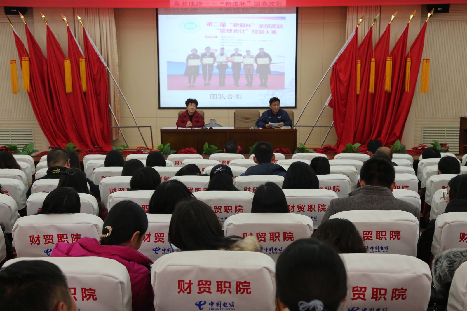 段文美院长作了题为《总结经验,共谋发展》的重要讲话。段院长回顾了全院2018年的技能大赛工作,对于取得的优异成绩予以了高度肯定,对辛勤付出的参赛团队、职能处室及台前幕后的工作人员致以了诚挚的谢意,并以“多点开花、重多突破”来总结全年的技能大赛工作。她指出,面对新时代向职业教育提出的新希望、新需求向人才培养提出的新目标,新竞赛向参赛队员提出的新要求,全院教职工要通过经验的交流,集思广益、群策群力,共同研究应对技能大赛新变化提出的新要求、新挑战,真正实现教育教学改革目的,促进我院教育教学水平的全面提升。最后段院长提出两点希望与全院教职工共勉:一是希望大家面对新形势、更新新观念,开拓新视野,以高度的责任感、使命感做好每一项工作,以务实创新的良好状态全身心投入到学院内涵建设的改革发展中。二是希望大家能够真正扎根讲台,潜心工作,以斗志昂扬的精神状态,把自己的理想刻在心中,把财贸的梦想扛在肩上,在为学院做出贡献的同时,成就精彩人生。