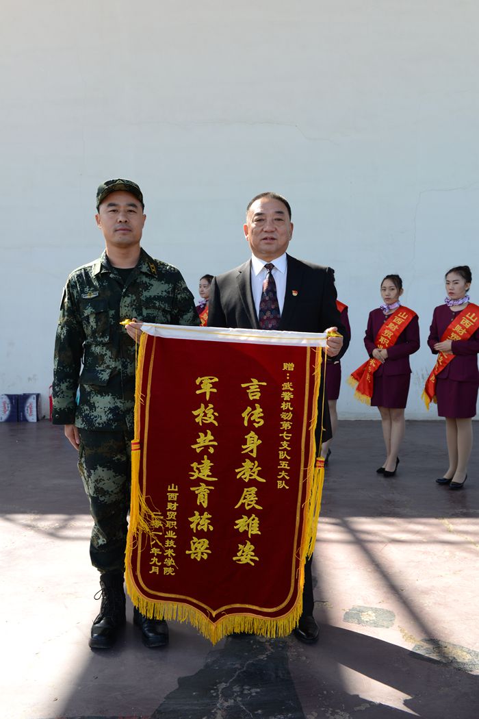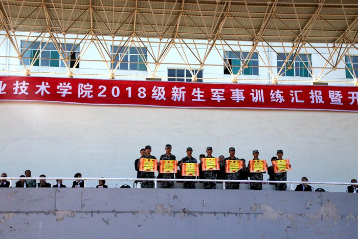 随后,与会人员观看了大一新生的军训表演。汇报表演后,我院为军训优秀学员和军训汇演优胜方队举行颁奖仪式。为感谢承训部队的辛苦付出,党委书记冯瑞明代表学院向承训部队赠送了锦旗。