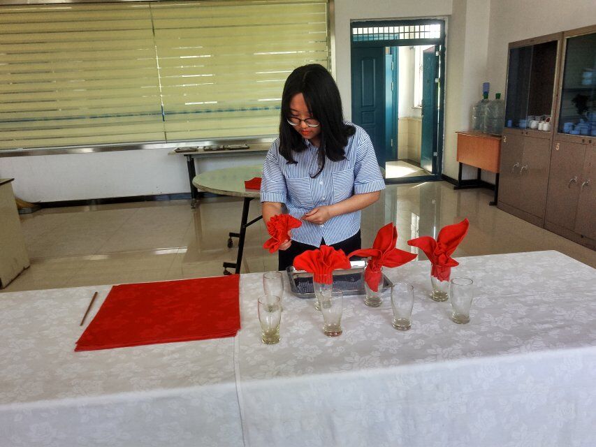 酒店管理专业比赛分为三个项目:折花、摆台、酒店英语。每班参与各项目的人数基数为10人。赛场上,同学们将专业教育成果最精彩的一面展现了出来;商务英语专业的选拔赛中,同学们以标准的语音、流利清晰的口语,展现了专业技能培养的成果;旅游管理专业的选拔,采用互联网技术,通过扫描二维码做题,题型与导游证考试的题型相结合。在无人监考的情况下,认真专注,沉着冷静,从容答题,展现出同学们良好的诚信意识。