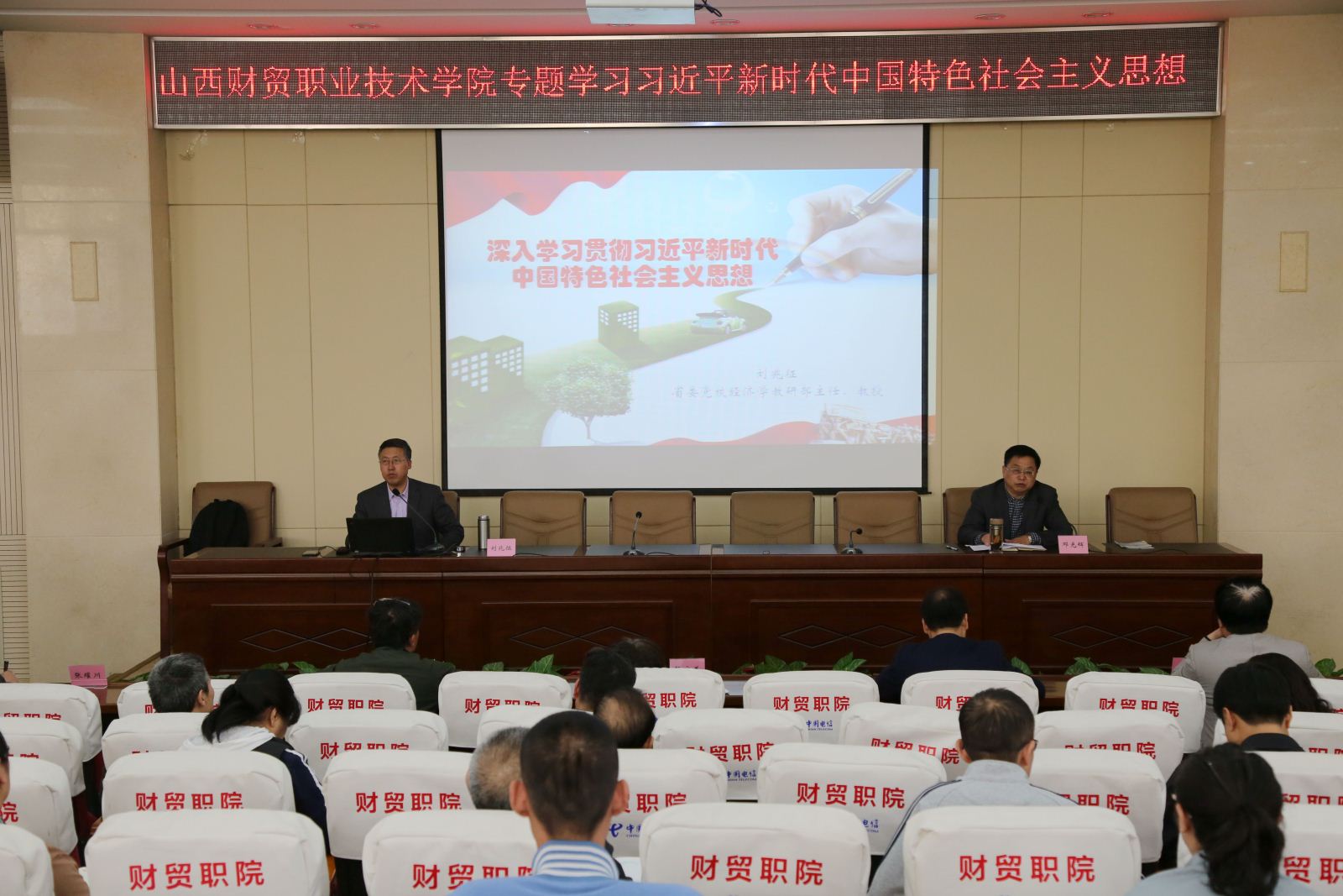 4月16日下午2:30,我院在大报告厅组织党委中心组(扩大)学习会议,专题学习习近平新时代中国特色社会主义思想,并特邀中共山西省委党校刘兆征教授作了《深入学习贯彻习近平新时代中国特色社会主义思想》专题辅导讲座。院领导班子成员、各党总支书记、基层党支部书记、各部门负责人和思政部全体教师参加了学习,聆听了刘兆征教授的专题辅导讲座。党委书记邓光辉主持了学习和讲座会议。