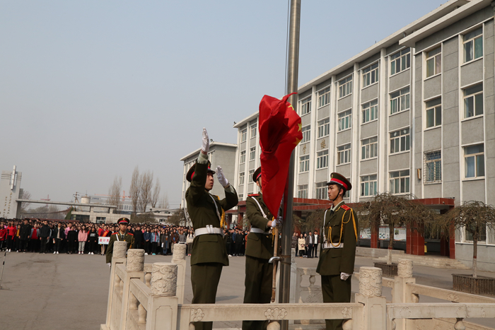 随着“迎国旗”的口令,英姿飒爽的国旗护卫队队员们护送着鲜艳的五星红旗入场。伴随着庄严的《中华人民共和国国歌》,五星红旗冉冉升起,迎风飘扬,全体师生行注目礼,表达了对祖国的无限热爱和敬意。