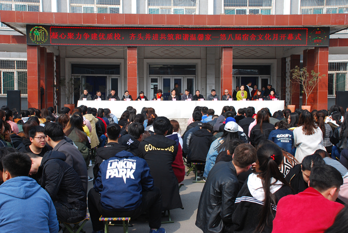 我院于2018年3月21日14:00,在博学楼广场隆重举行了以“凝心聚力争建优质校,齐头并进共筑和谐温馨家”为主题的第八届宿舍文化月活动开幕仪式。