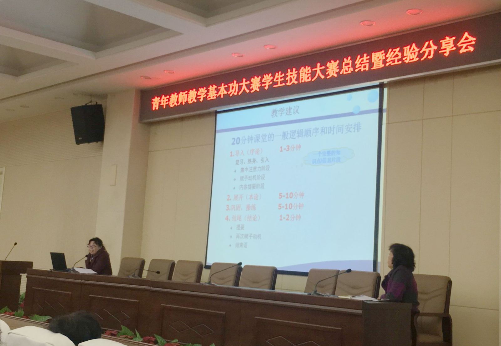 孙金霞处长对青年教师教学基本功大赛参赛教师以及我院参赛评委进行了逐一介绍,冯春、尹珍、张文英、韩伟老师以及安红梅、田毅评委分别为大家做了参赛经验分享。
