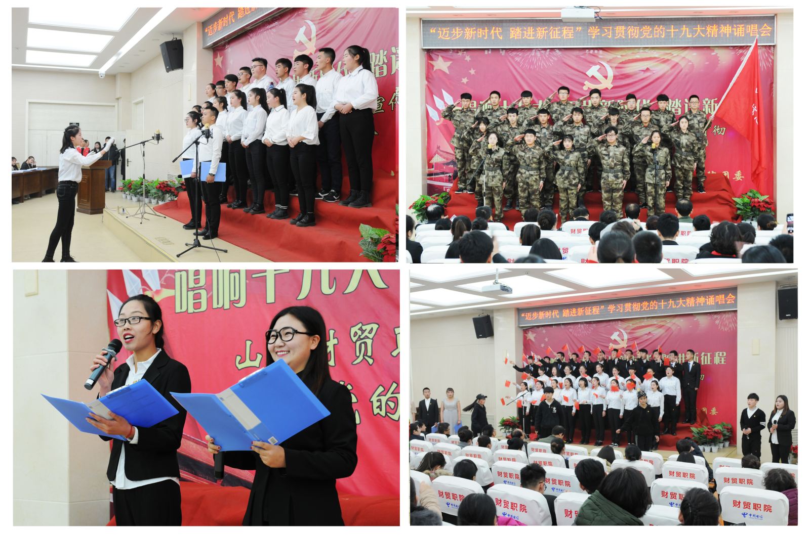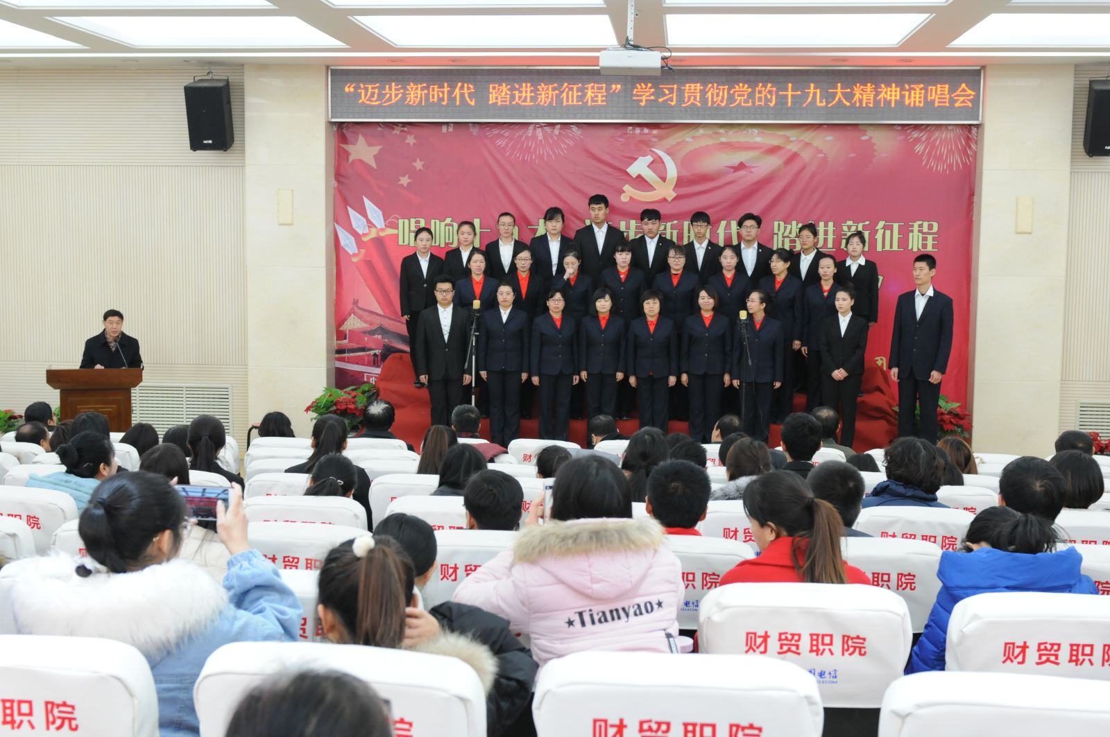 诵唱会围绕“迈步新时代 踏进新征程”主题,采取合唱、朗诵、群口快板及其他多种艺术形式,歌颂我国十八大以来新成就,歌颂伟大祖国进入新时代,歌颂人民幸福美好新生活。诵唱伊始,全体起立,同唱《中华人民共和国国歌》,满满的自信心,勃发的精气神洋溢全场。从《赞“红船”》到《没有共产党就没有新中国》;从《血染的风采》到《当那一天来临》;从《我和我的祖国》到《祖国不会忘记》;从《“我的祖国”之走向复兴》到《祖国,你就是我要唱的那首歌》;从《十九大精神放光芒》到《迈进新时代踏上新征程》再到党委书记邓光辉、副书记李志慧现场赋诗抒怀,传递着大家《不忘初心》的共同心声,节目精彩纷呈,热情饱满高涨。诵唱了财贸全体党员和师生员工团结进取、砥砺前行、再铸辉煌的责任感和使命感,诵出了对党的忠诚与热爱,唱出了实现中国梦的信心与力量。