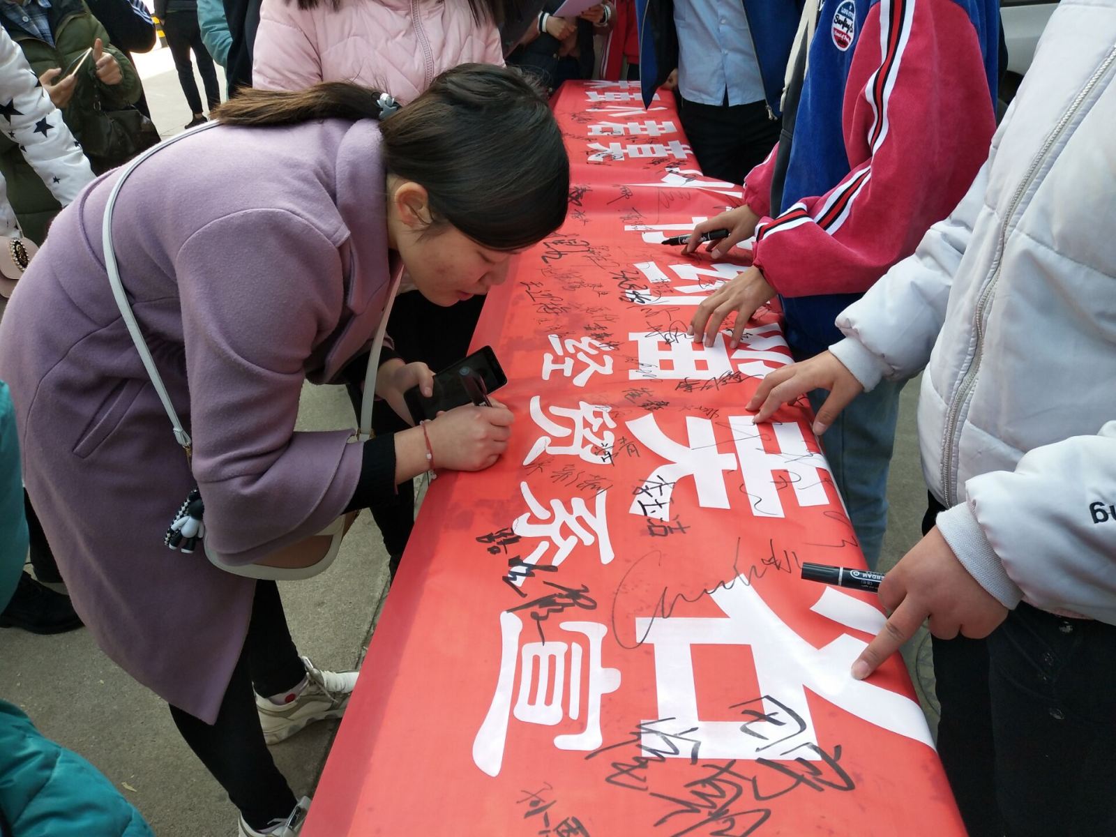 11月20日中午12:00在学生食堂门口开展了“粒米虽小君莫扔,勤俭节约留美名”的签字仪式,过往同学踊跃参加,都在横幅上庄重的签下自己的名字,表达自己节约粮食的决心。签名结束后,将被密密麻麻的签名所覆盖的条幅挂在餐厅大门上方,警示同学们文明餐桌、光盘行动。