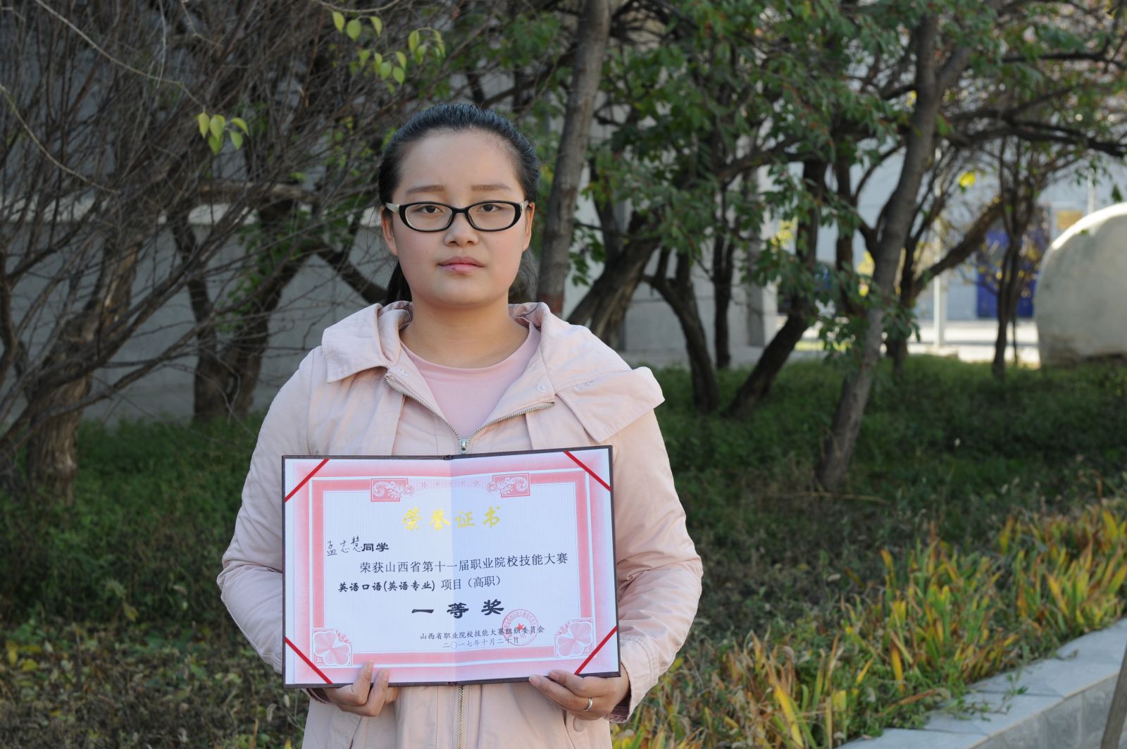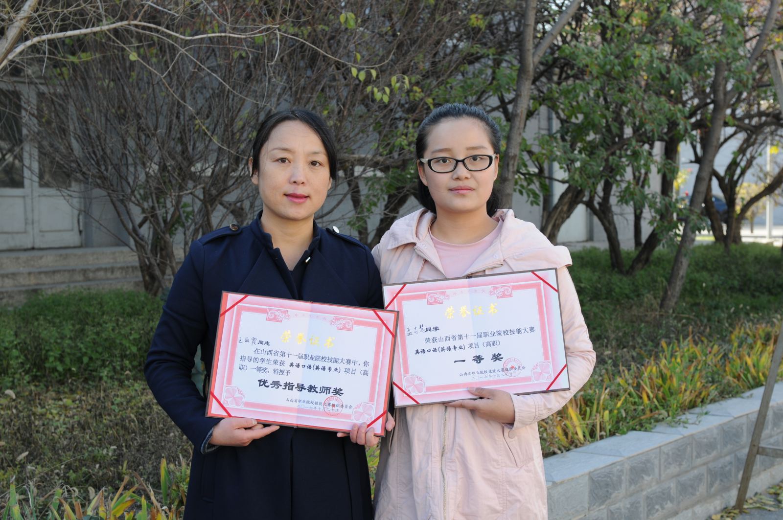 此次口语大赛分英语专业和非英语专业两个赛组,初赛,复赛和决赛三个阶段。初赛和复赛在各参赛院校进行,决赛于2017年10月20日在山西省财政税务专科学校进行。每个参赛院校选送一名英语专业及非英语专业的选手参赛。由王丽霞老师指导的商英1501班孟志慧同学作为英语专业选手,代表我院参加了决赛。我省参加此次口语大赛决赛的英语专业组共有11个高职高专院校代表队,评委包括我省英语教育界七名专家。英语专业组11名选手经过激烈的角逐,孟志慧同学荣获第一名的好成绩,王丽霞老师获优秀指导教师奖。