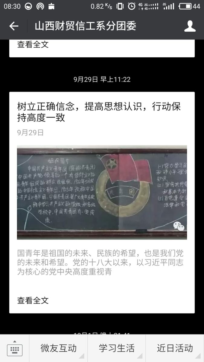 近日,习近平总书记围绕青少年和共青团工作发表了一系列重要论述,深刻阐述了新形势下青少年和共青团工作的重大理论和实践问题,指明了当代青年的历史使命和成长道路,根据院团委通知要求,信息工程系分团委于2017年9月28日、10月10日分别开展了学习《习近平关于青少年和共青团工作论述摘编》团日活动、学生干部读书研讨会。