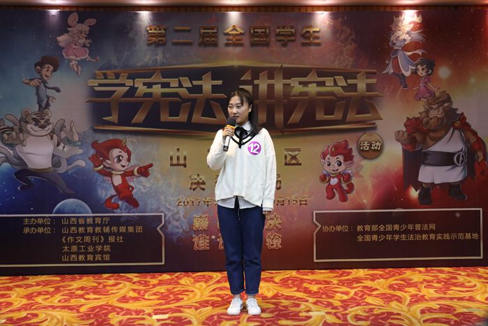 2017年10月15日下午两点,第二届全国学生“知宪法讲宪法”演讲比赛山西赛区总决赛在教育宾馆二层会议室拉开帷幕。此次活动由山西省教育厅主办,《作文周刊》协办,各市教育局、各高等学校、省直中专学校认真配合、积极参与,在全省范围内开展了以宪法教育为重点的青少年法治教育,增强了广大学生的宪法意识,弘扬了宪法精神,营造了崇尚宪法、遵守宪法、维护宪法权威的良好氛围。
