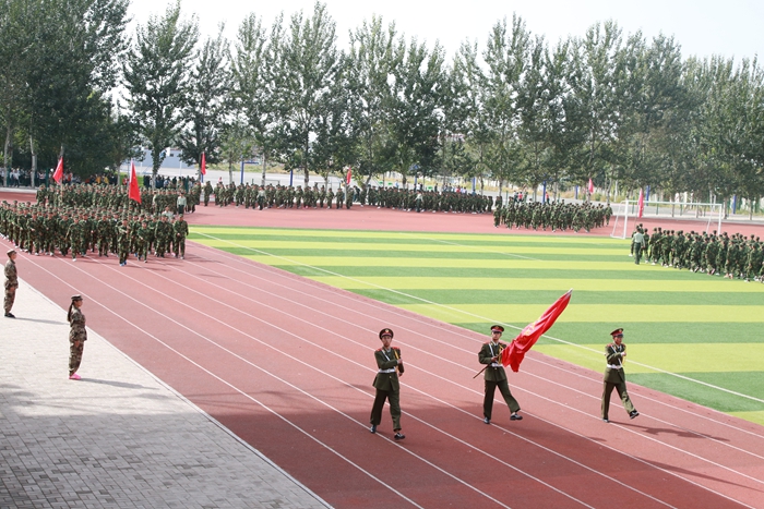 金风送爽、碧空澄澈,我院于9月22日下午在田径场隆重举行2017级新生军训成果汇报表演。学院领导班子成员、相关部门负责人、各系主任及党总支书记、承训官兵、新生班班主任及全体新生参加了仪式并观看了汇报表演。仪式由副院长尤陶江主持。 伴随着激扬奋进的《中国人民解放军进行曲》,2017级新生军训成果汇报表演拉开了序幕。标兵就位,迎军训团团旗,分列式表演正式开始。伴着雄壮的奏乐,军训团19个方队依次入场。同学们以整齐划一的步伐,喊着嘹亮的口号,昂首阔步通过主席台,接受与会领导和老师们的检阅。他们身姿挺拔、士气高昂、意气风发,充分展现了当代大学生积极向上、拼搏奋进的精神风貌。分列式后,进行了基本队列动作表演和军体拳表演,整场表演动作刚健有力,气势恢宏,震撼人心,迎来了场上雷鸣般的掌声。 汇报表演后,副院长张耀川宣布了军训汇演优胜方队和军训优秀学员名单,并举行颁奖仪式。 院长段文美向部队首长贾树航副处长赠送锦旗,对他们的辛苦付出表示感谢。
