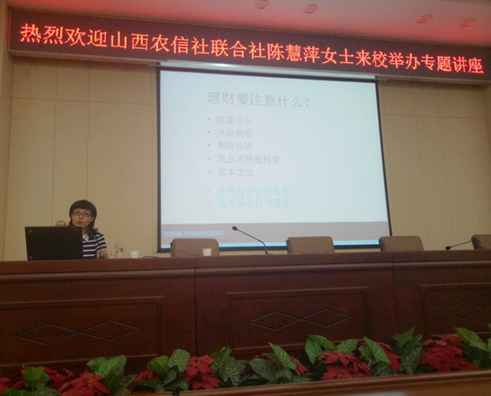 2017年6月19日,山西财贸职业技术学院励志楼大报告厅内座无虚席,山西省农村信用社联合社财务会计部主任、学院校友陈慧萍受邀,为我院师生讲了一堂生动的“人生体会和感悟”专题讲座。财管系党总支副书记罗丽娟主持讲座,学院工会主席梁利民以及陪同主讲人随行的三位校友也参加了此次讲座。