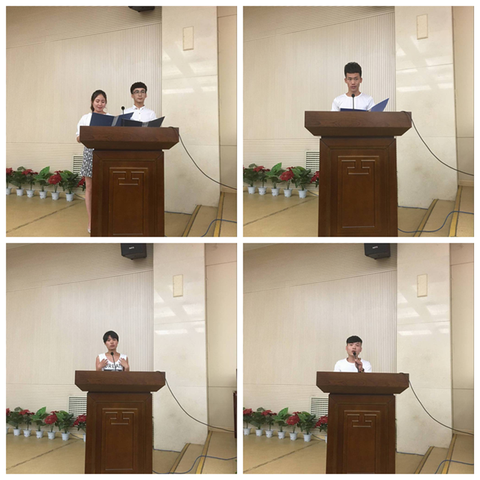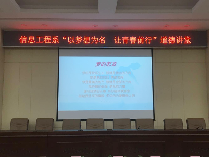 为筹备此次道德讲堂,信息工程系分团委从5月31日起在全系同学中进行了多次调查,录制了关于梦想的微视频,寻找不忘初心、为梦想不懈努力的同学讲述奋斗历程等等。此次道德讲堂以“七个一”的形式开展:做一番省身、看一段视频、诵一部经典、读一篇文章、唱一首歌曲、讲一个故事、做一个榜样。原拟邀请我系优秀毕业生郝照红亲临讲堂,遗憾的是因其他原因未到现场,特意录制了一段VCR劝勉学弟学妹。郝照红1999年7月毕业于我系制冷与通风空调专业,在校期间任学生会干部,学习刻苦,工作认真踏实。毕业后怀揣财贸学子的梦想,工作之余从不放弃学习,考取了安全管理员资格证书、制冷与通风空调职能资格证书、机电工程师、二级注册建造师等证书,现已荣任太原六味斋实业有限公司副总。他的成功经历很好的诠释了“今天我以校为荣,明天校以我为荣”,激励同学们永不言弃,不断努力,美梦终会成真。