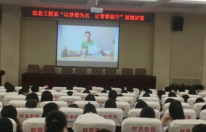 为深入贯彻落实高校思想政治工作会议和《关于加强和改进新形势下高校思想政治工作的意见》精神,深化青年学生社会主义核心价值观培育,根据学院2017年道德讲堂活动安排,信息工程系于2017年6月19日下午一点半在励志楼大报告厅举办了“以梦想为名 让青春前行”道德讲堂活动。出席本次活动的嘉宾有党委委员、学生处处长崔景俭、组宣部部长雷桂萍、旅游系党总支书记吴艳东、信息工程系党总支书记李美英、院团委书记马娟、财管系分团委书记郝小磊、信息工程系分团委书记张鹤、信息工程系专职辅导员梁润清。信息工程系2015级全体同学、2016级各班团干共240余人参加了此次活动。