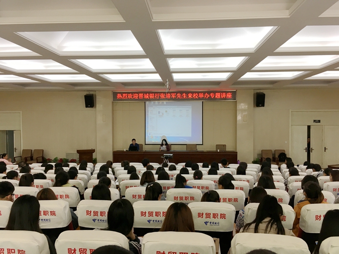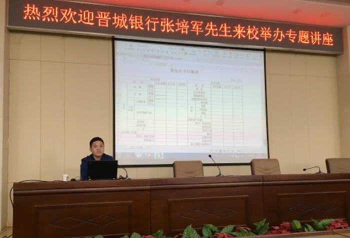 为办好我院2017年职业教育周活动,大力弘扬社会主义核心价值观和“劳动光荣、技能宝贵、创造伟大”的时代风尚,推进职业教育的健康发展,加快技能型人才培养,财管系紧紧围绕“共筑职教梦喜迎十九大”主题,密切结合我院特点与育人环境,尝试改变专业授课方法,立足校企交流模式,借助杰出校友资源,于2017年5月5日组织金融与保险专业的同学们参加了一场别开生面、深入浅出的金融知识科普讲座,主讲人为晋城银行总行票据业务部总经理张培军先生。