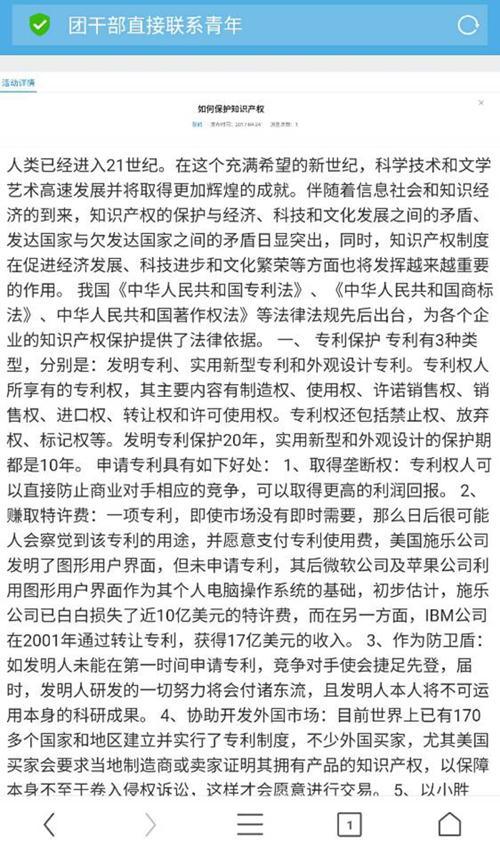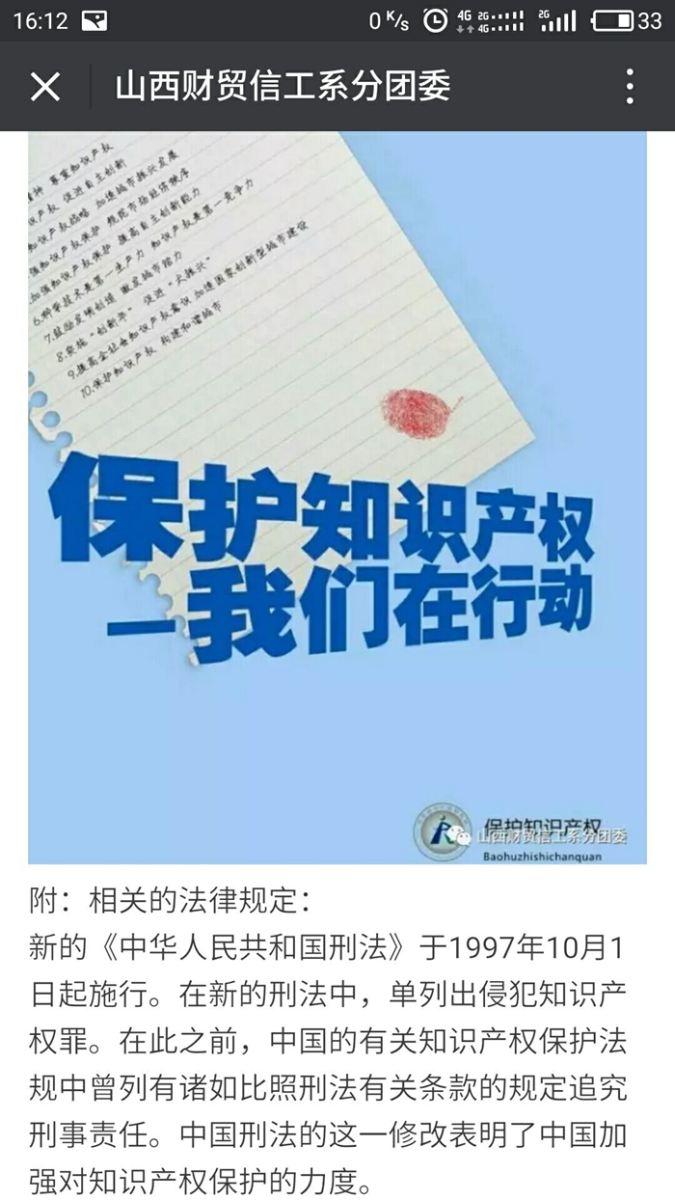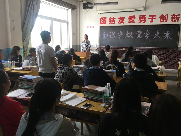 活动期间,系分团委以微信公众平台、1+100团干部联系青年、黑板报、发放宣传资料等方式,积极宣传知识产权宣传周活动主题和相关内容,营造良好的宣传舆论氛围。2017年4月24日下午,以班级为单位,开展了知识产权宣传主题活动,扩大宣传覆盖面,增强宣传时效,切实提高学生的知识产权意识。