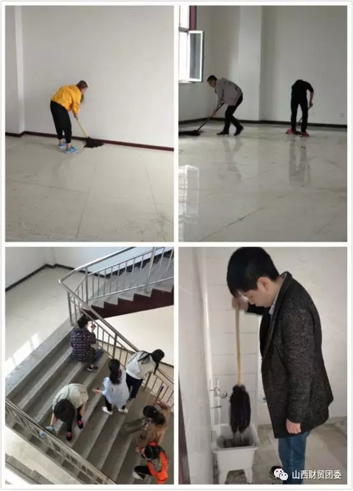 青年志愿者们对社区办公楼进行义务清扫