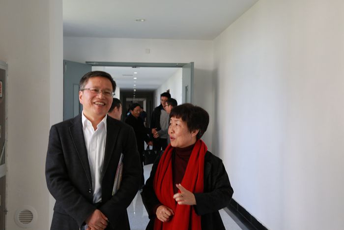 段文美院长与苏州经贸职业技术学院赵驰轩院长在实地考察时进行交流