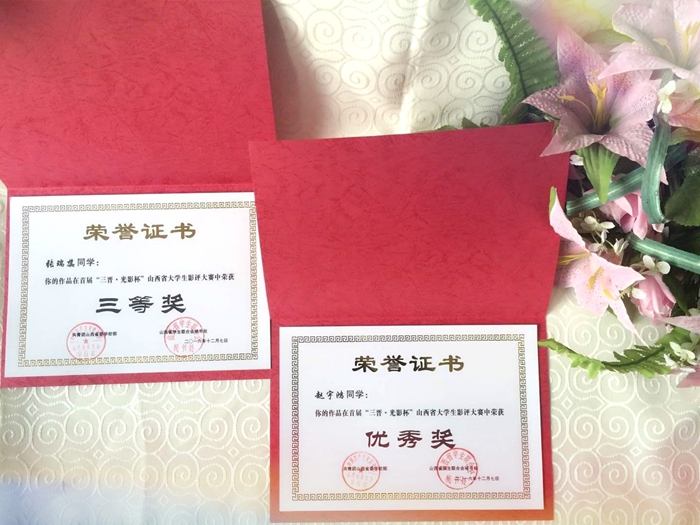 本次大赛自启动以来得到了学院领导的高度重视,在院团委的精心组织和各系分团委的积极配合下,我院共有18件作品参赛,经过大赛组委会初审、复审以及专家评审等环节,对全省24所高校上千名学子提交的1922份参赛作品进行了遴选,最终筛选出110件精品佳作。其中,我院共有2件优秀作品获奖,分别是:财管1503班张瑞蕊同学的影评《大红灯笼高高挂》荣获三等奖;财管系保险1601班赵宇鸿同学的影评《大红灯笼高高挂》荣获优秀奖。两位获奖同学于2016年12月7日在指导教师冯学的带领下赴山西农业大学信息学院与省内其他获奖院校的师生相约晋商故里,并在乌马河畔出席了首届“三晋·光影杯”山西省大学生影评大赛的颁奖盛典。