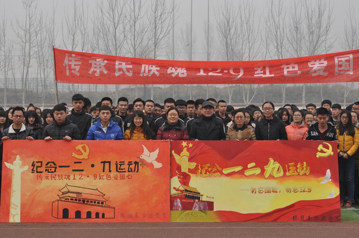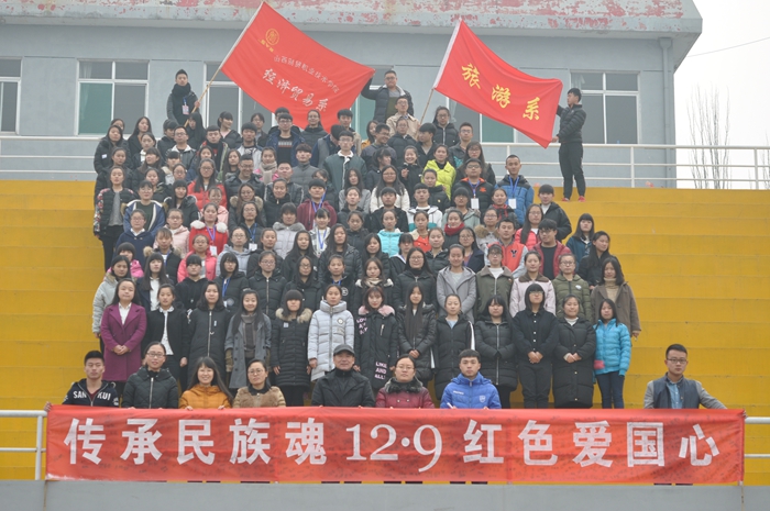 为了弘扬爱国主义精神,培养广大青年团员的历史使命感、责任感和高尚的道德情操,进一步激发广大青年学生学好技能、投身社会、报效祖国,实现中华民族伟大复兴的百年梦想,经贸系、旅游系分团委于2016年12月12日下午2:00在我校大操场举办了以“传承民族魂 红色爱国心”为主题的“一二·九”纪念活动。院团委马娟老师和刘秀峰老师、旅游系吴艳东老师和申钰莹老师、经贸系冯春老师和夏海鹏老师以及两系全体大一学生和大二团干共计460名学生参加了本次活动。
